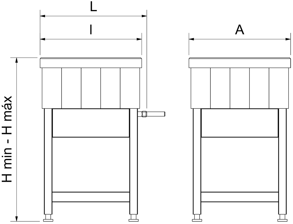 | L (mm) | A (mm) | H_max (mm) | H_min (mm) | l (mm) | Kg | Referenz | Lager | Preis | Menge | Aktion |