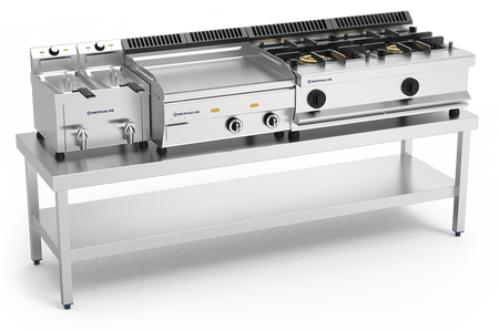 Made entirely of high-quality stainless steel with a soundproofed and reinforced top with a thickness of 1.5 mm. The lower shelf, if selected, is made of reinforced stainless steel with a thickness of 0.8 mm.