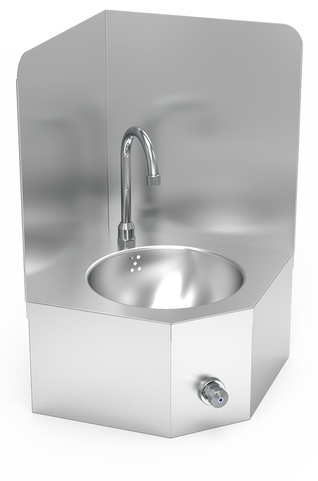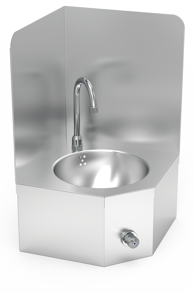 Stainless steel corner model wall-mounted hand washbasin. Knee operated. Not mobile. Mixed hot and cold water.