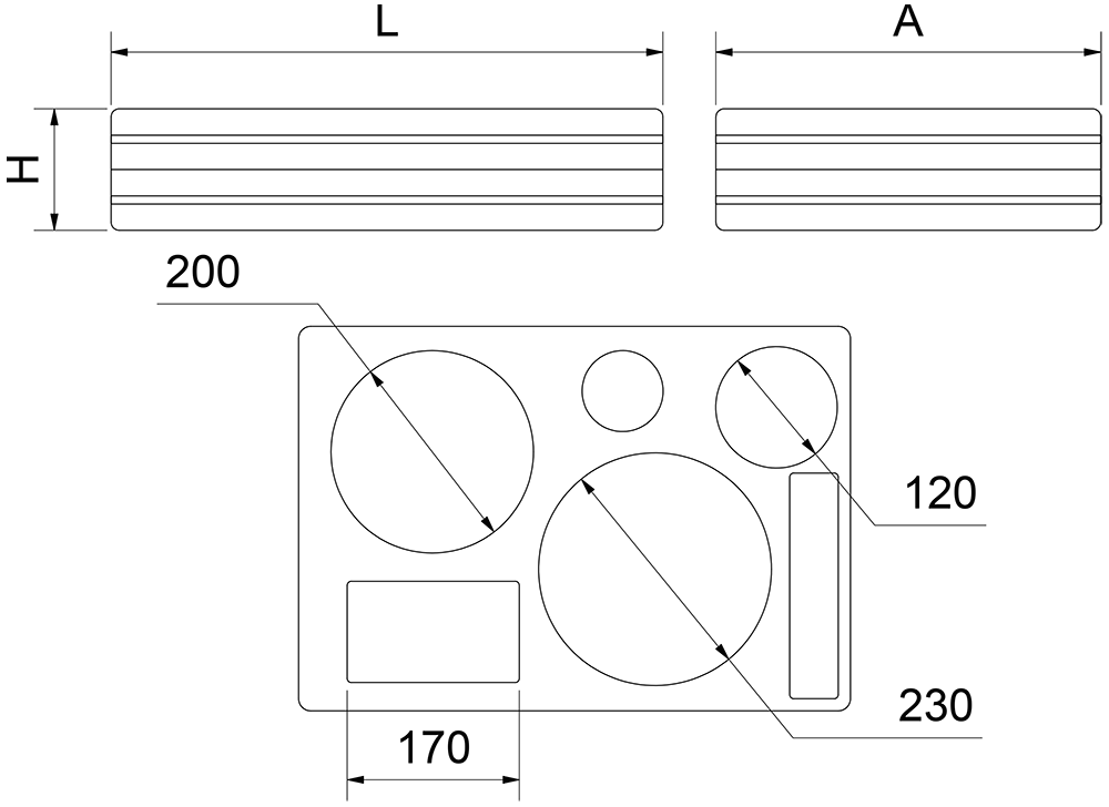 | L (mm) | A (mm) | H (mm) | Number of plates | Kg | Reference | Stock | Price | Quantity | Action |