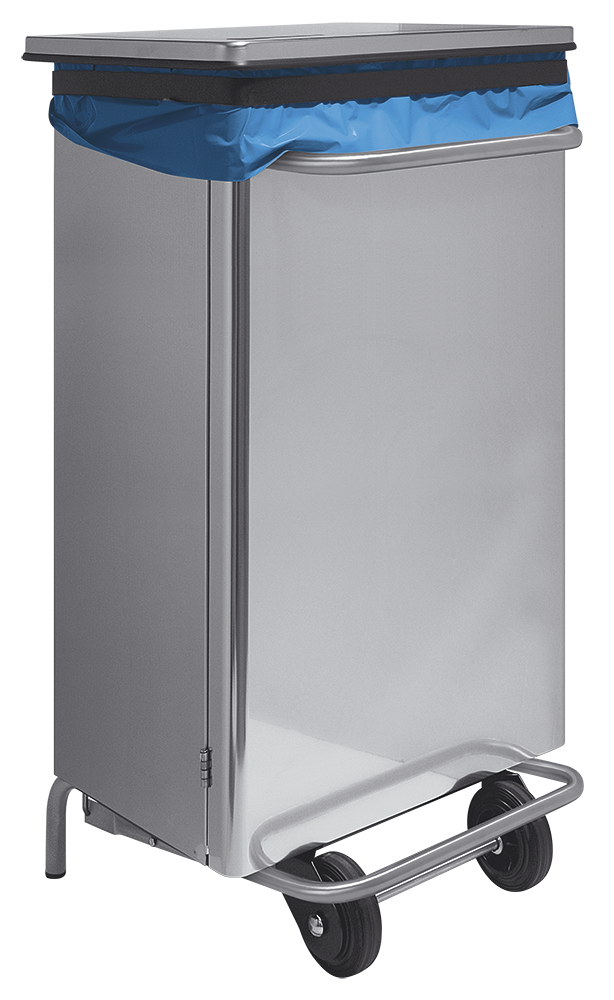 Product Description: Trash can designed for professional use in environments requiring high hygiene standards. It features a top ring with a fastening system for bags up to 110 liters, robust rear wheels, and a closed front structure that enhances cleanliness and overall appearance. Its ergonomic design facilitates transport and emptying without contact with waste.