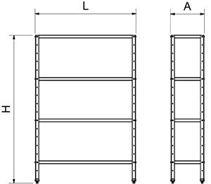 | L (mm) | A (mm) | H (mm) | Number of levels | Load resistance (kg) | Kg | Reference | Stock | Price | Quantity | Action |
