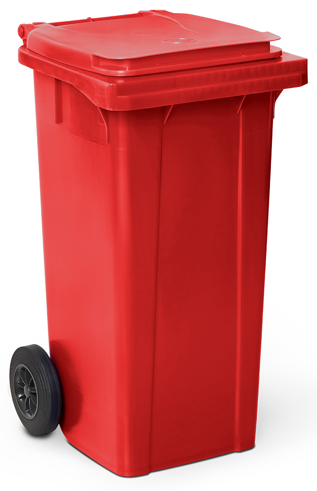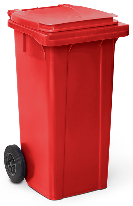 Garbage container with 120 LTS Red Sun lid and Red DIM casters.
