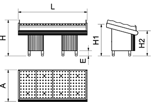 | L (mm) | A (mm) | H (mm) | E (mm) | H1 (mm) | H2 (mm) | Number of feet | Kg | Reference | Stock | Price | Quantity | Action |