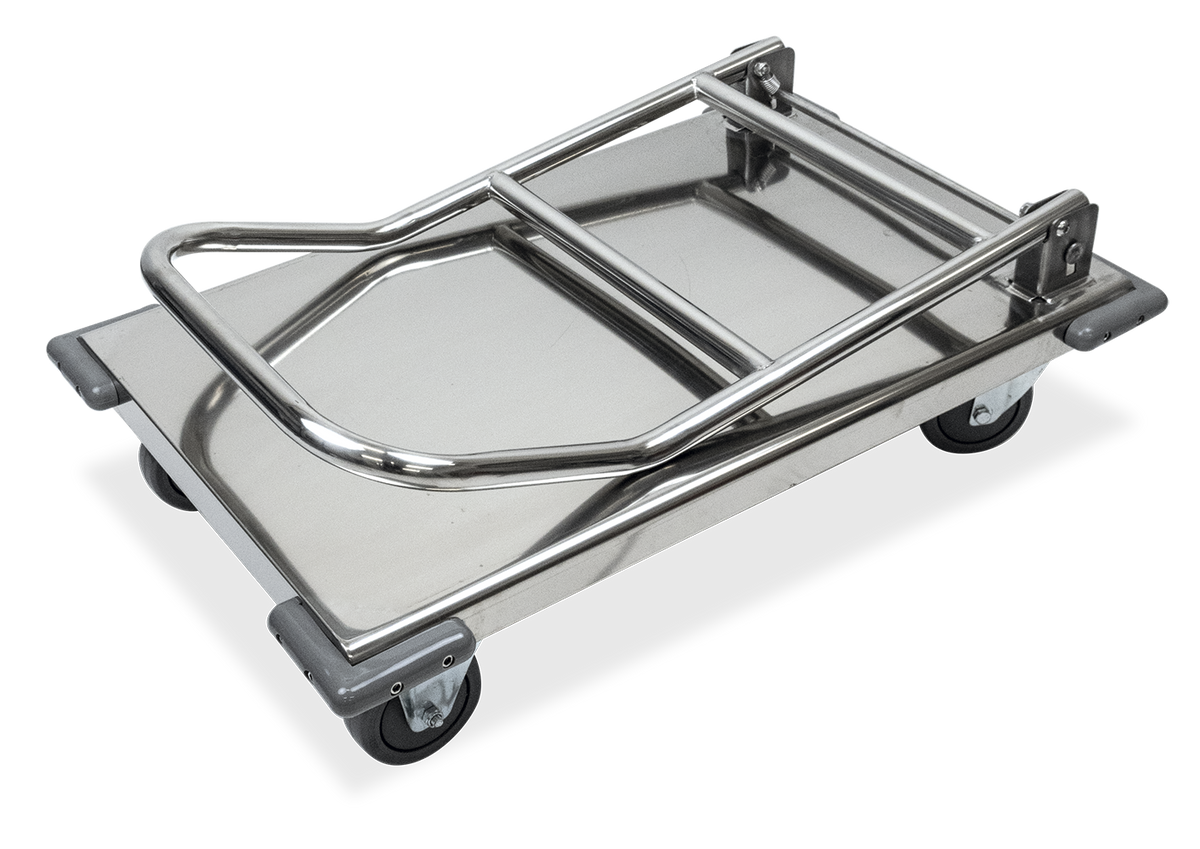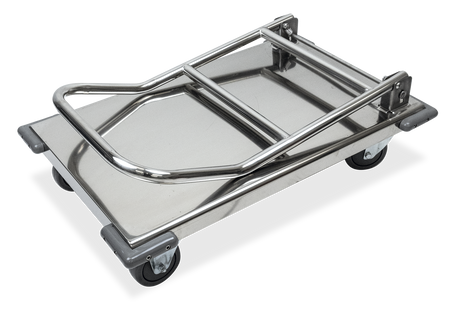 Special stainless stainless steel platform trolley for use in warehouses. It incorporates a platform with a load capacity of up to 300 kg.