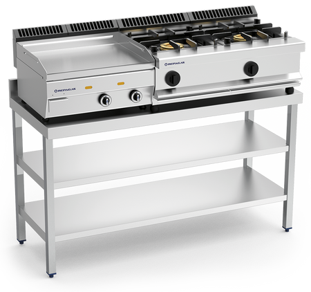 | L (mm) | A (mm) | H (mm) | E (mm) | Type of table | Number of low shelves | Kg | Reference | Stock | Price | Quantity | Action |