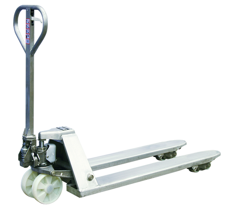 Ideal for the meat, dairy, canning industries, and all areas where corrosive acids and saline solutions are used. This stainless steel pallet truck ensures hygienic and safe handling of goods in demanding environments.