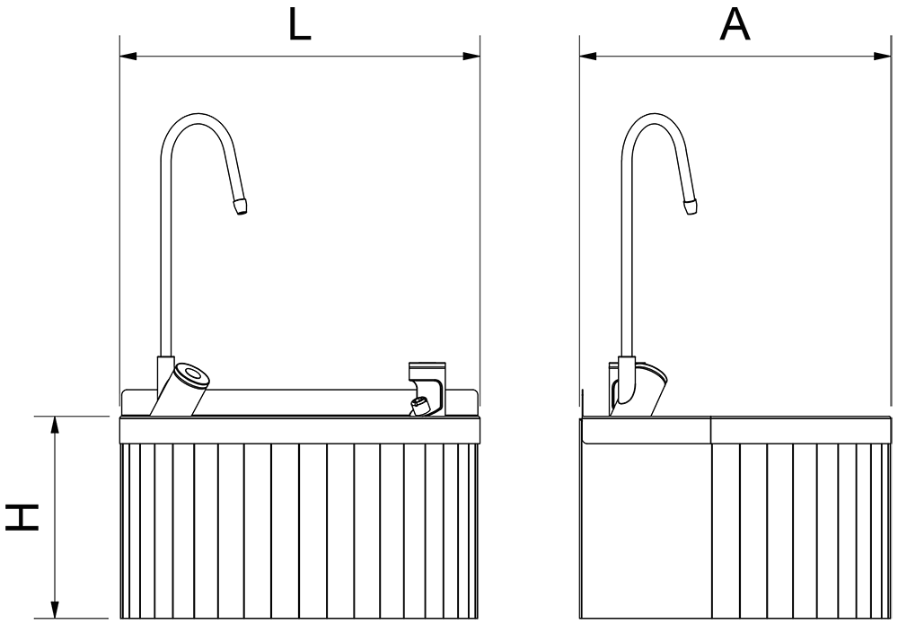The stainless steel wall fountain with touchless electronic faucets is a hygienic and modern solution for dispensing drinking water. Designed for professional and public environments, this fountain is equipped with two distinct faucets: an angled mouth rinser for direct drinking and a high faucet for filling pitchers or bottles, both operated by infrared sensors, ensuring touchless use.
