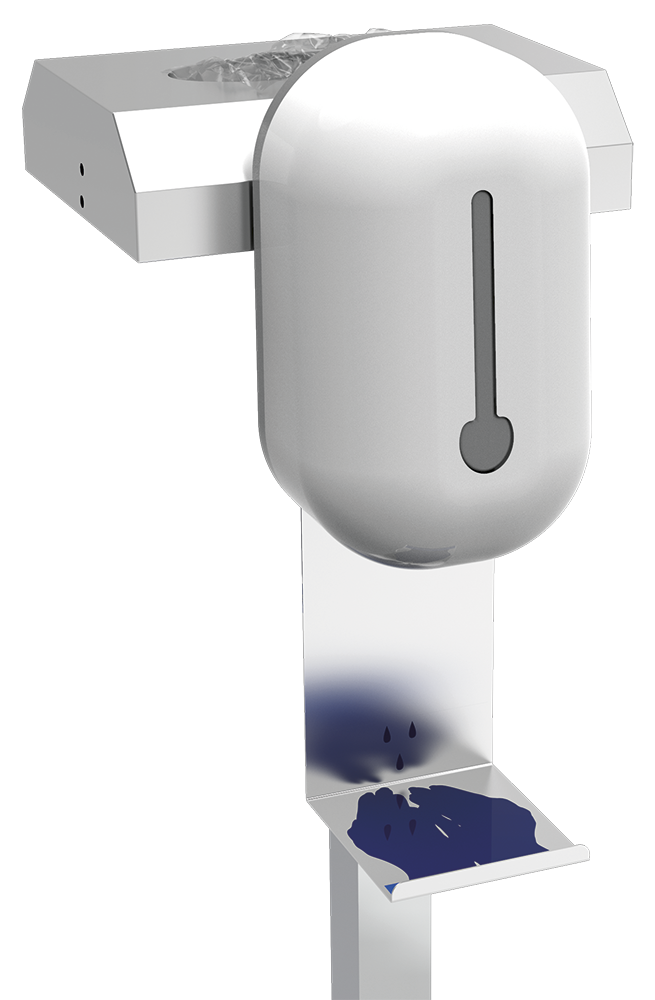 Questo set di distributori di gel idroalcolico su colonna include un distributore di guanti, un distributore di gel idroalcolico e un supporto di colonna in acciaio inossidabile AISI 304. Comprende un vassoio antigoccia inferiore.