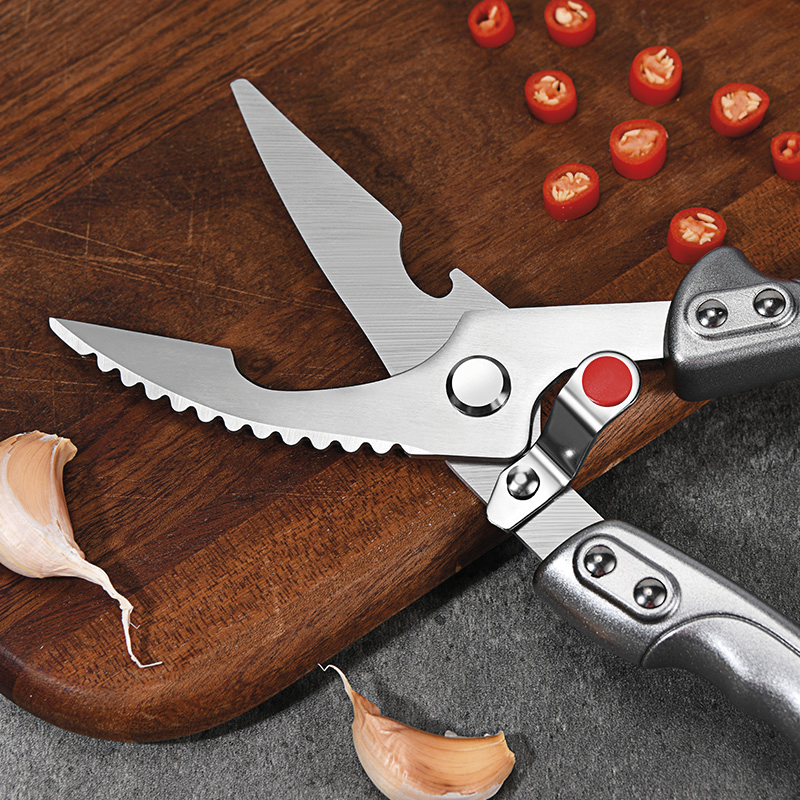 Description initialeConçus pour un usage intensif, ces ciseaux associent des lames en acier de haute qualité à une poignée ergonomique. La forme travaillée des lames permet de découper avec précision tout en limitant l’effort, ce qui en fait un outil fiable pour les chefs, bouchers, traiteurs et cuisines d’entreprise.