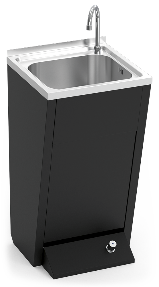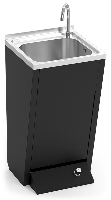 Lavabo accessibile su piedistallo della **Serie Black**, progettato per offrire funzionalità, sicurezza ed eleganza negli ambienti professionali. Realizzato in acciaio inossidabile verniciato nero opaco, combina robustezza e design sofisticato. La sua attivazione tramite pedale a pulsante garantisce un utilizzo igienico ed efficiente. Compatibile con acqua calda e fredda, può essere collegato anche solo all'acqua fredda o a un miscelatore regolato tramite la valvola miscelatrice antiritorno inclusa.