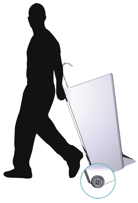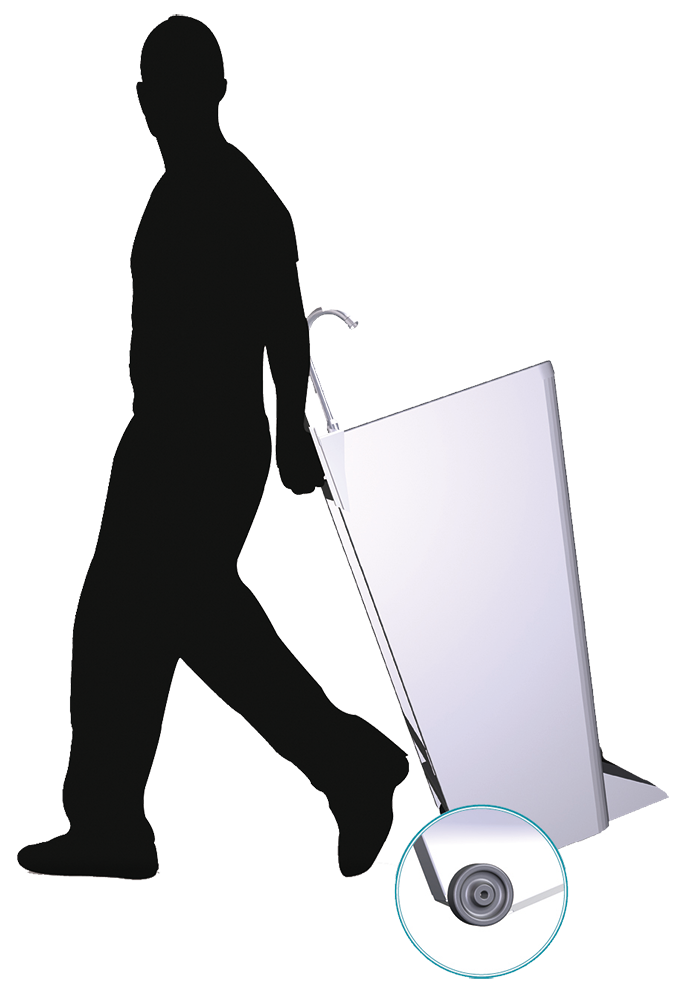 Integra una maniglia di blocco posteriore e ruote per un facile trasporto, oltre a un cestino integrato, accessibile tramite un portello ribaltabile, ottimizzando così lo spazio nel modo più discreto possibile.