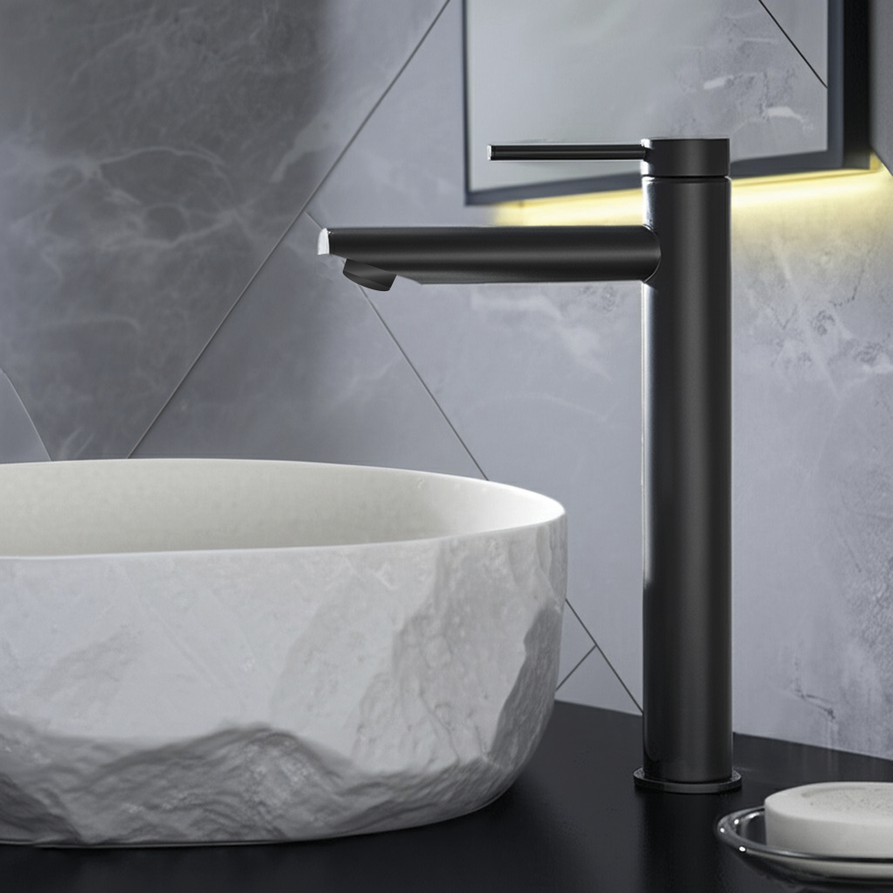 Gamma di rubinetteria per bagno dal design cilindrico e finitura nera opaca, progettata per spazi contemporanei che uniscono eleganza e funzionalità.