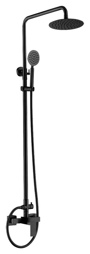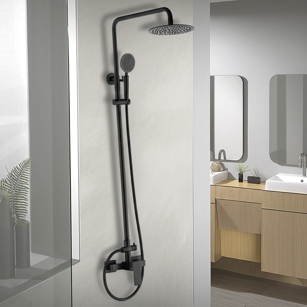 Gamma di rubinetteria per bagno dal design angolare e finitura nera opaca, progettata per spazi contemporanei che combinano eleganza e funzionalità.