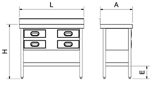 Tavolo a muro in acciaio inox con 4 cassetti a destra