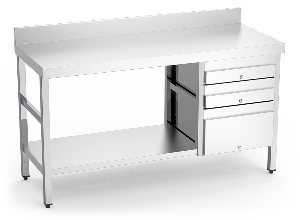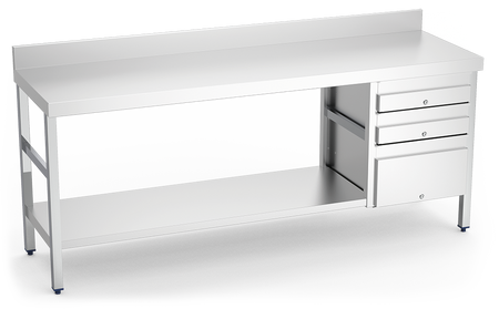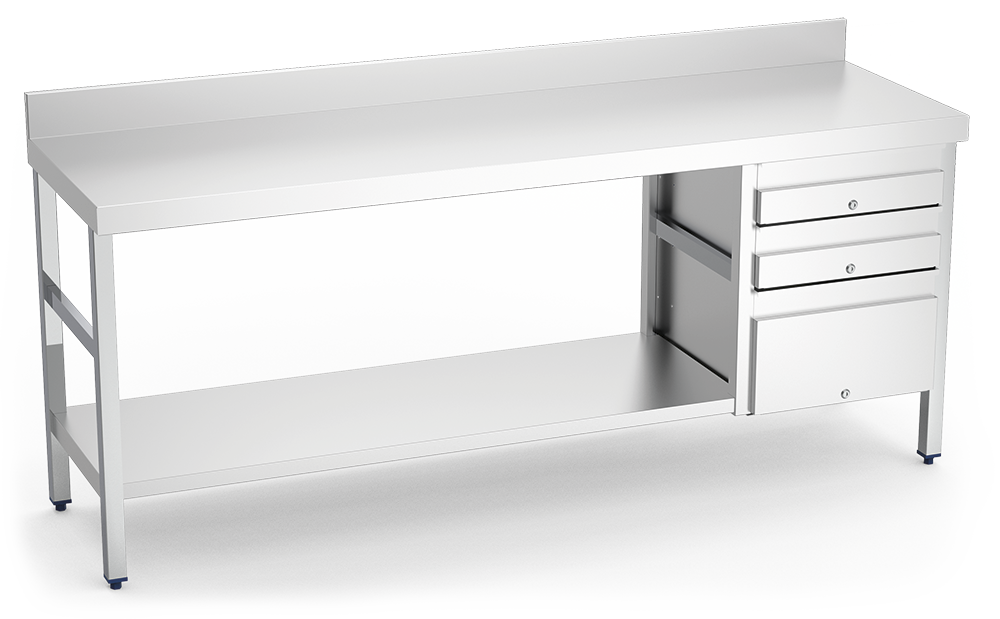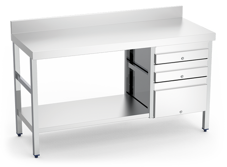 Descrizione del prodotto: Gamma di tavoli a muro in acciaio inossidabile con moduli di 3 cassetti, disponibili in versione destra o sinistra. Progettati per offrire funzionalità, organizzazione e robustezza negli spazi di lavoro professionali. I tavoli comprendono una mensola inferiore, uno schienale e gambe regolabili in altezza, disponibili in diverse lunghezze e profondità per adattarsi a diversi layout.