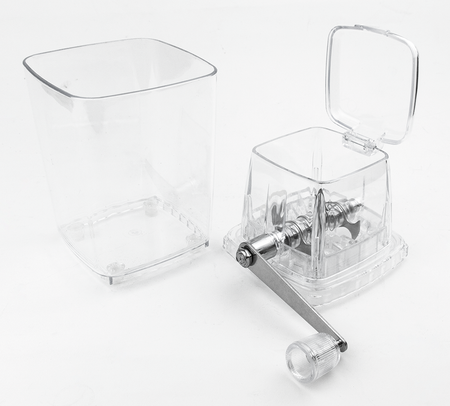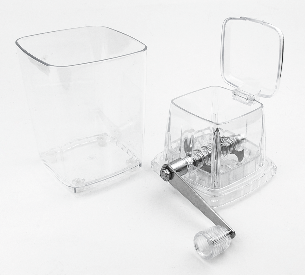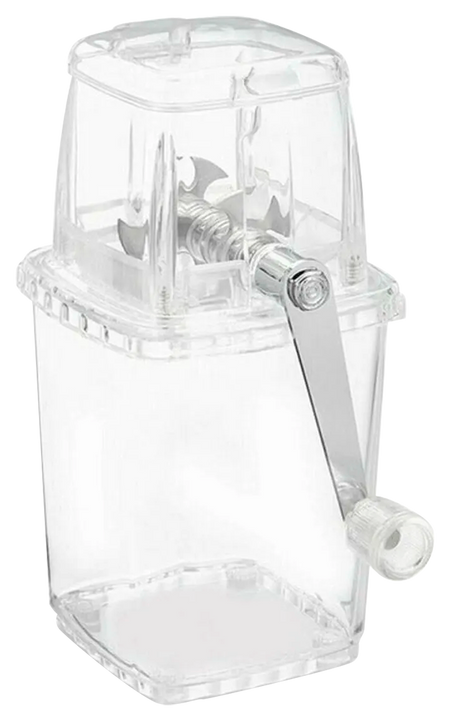 Broyeur à glace conçu pour un usage domestique et professionnel, avec un corps transparent permettant de visualiser la quantité de glace traitée. Sa structure ergonomique facilite la manipulation et assure des résultats constants.