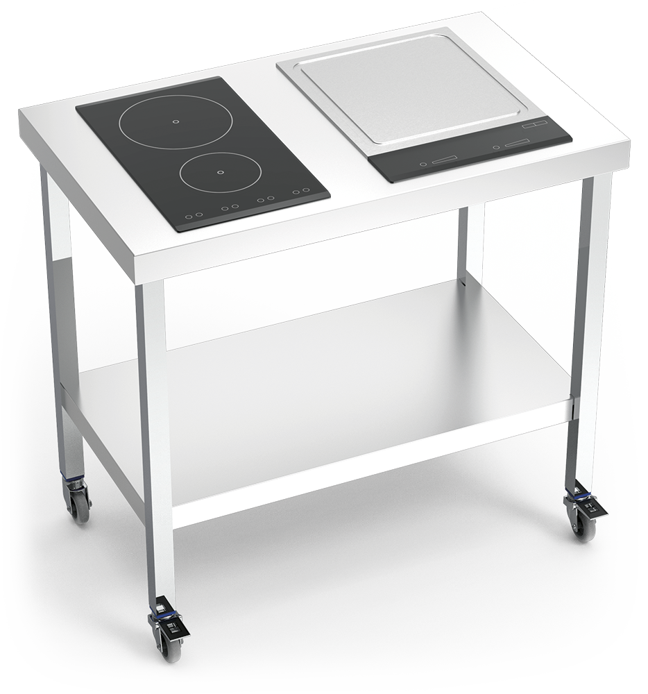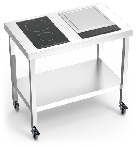 Cuisinière inox professionnelle induction 2 foyers + Teppan Yaki. Table inox cuisson induction.