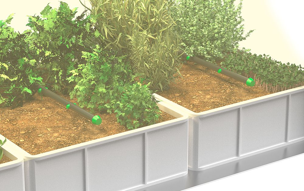 Un système d'irrigation goutte à goutte (015620/015624) est proposé en option pour assurer un approvisionnement constant en eau aux plantes, optimisant l'absorption des nutriments et minimisant l'effort requis pour l'entretien.