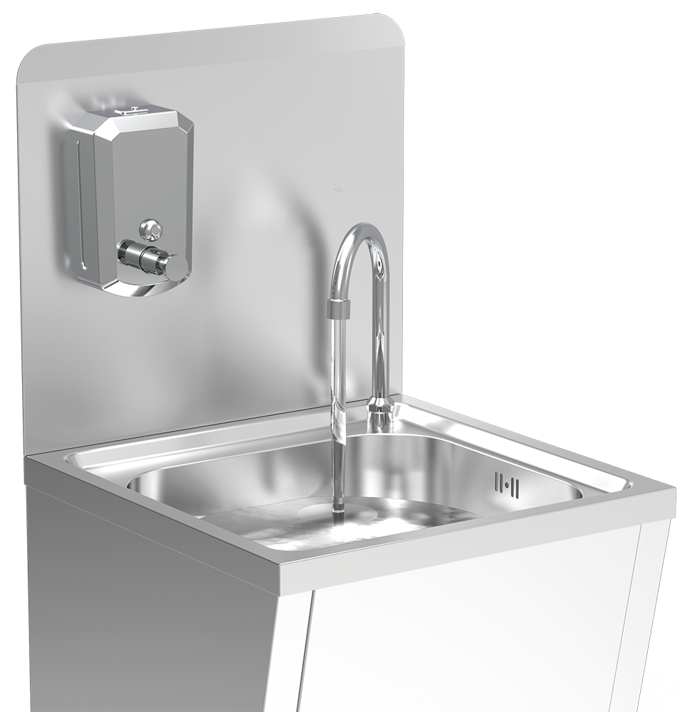 Lave mains inox sur pied + Dosseret inox + Distributeur de savon en inox
