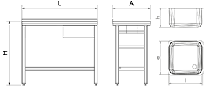 L (mm) | A (mm) | H (mm) | a (mm) | Nombre de bacs | Nombre d'égouttoirs | Profondeur ou hauteur (mm) | l (mm) | Nombre d'étagères basses | Kg | Référence | Stock | Prix | Quantité | Action |