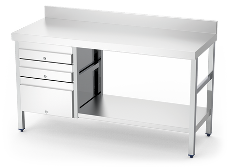 Table murale avec 3 tiroirs à gauche en acier inoxydable pour environnements professionnels