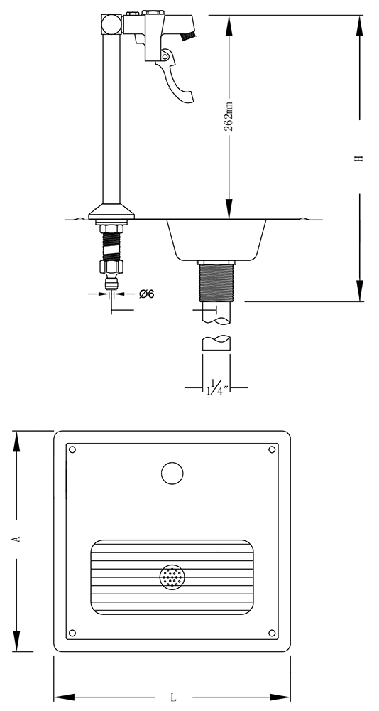 | L (mm) | A (mm) | H (mm) | Taxa de fluxo (l/min) | D (mm) | Kg | Referência | Estoque | Preço | Quantidade | Ação |