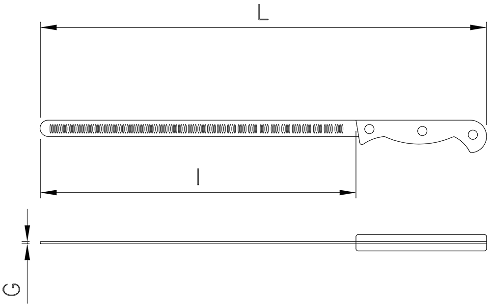- Lâmina longa e flexível em aço inoxidável com revestimento de titânio para um corte preciso e duradouro.