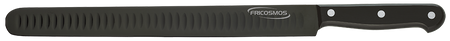 Faca de salmão com revestimento de titânio, cabo injetado e lâmina alveolada, concebida para fatiar finamente os filetes de salmão e outros peixes sem aderência. Ideal para uso profissional e doméstico.