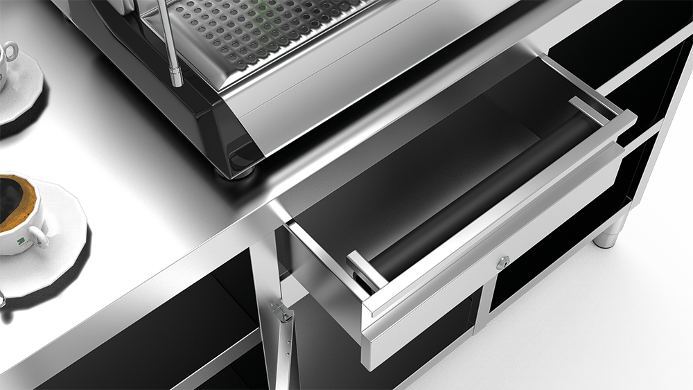 Dans le module central intègre un tiroir préparé pour le marc de café. Dans la partie inférieure inclus une armoire à porte battante. Sur chaque côté, inclus des modules de 3 tablettes pour augmenter l'espace de stockage.